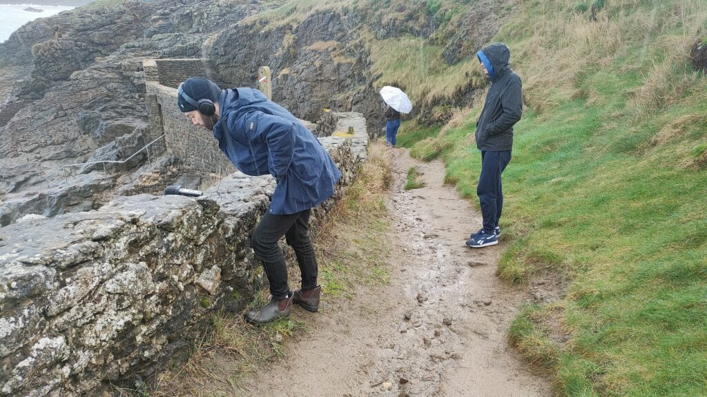 There, our Sound Designer sits close to the waves to record. Everything is captured, from the waves crashing on the rocks, the foam retreating to the sea, the sound of boots in the sand, the pitter-patter of the rain hammering the landscape.